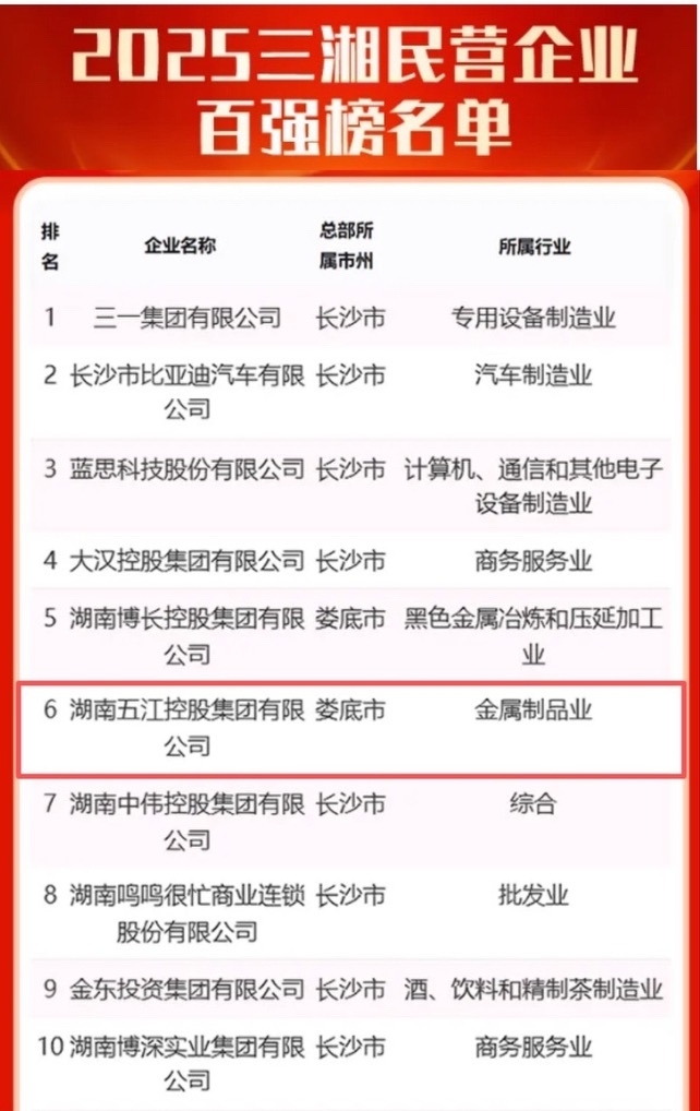 2025年12月18日,2025三湘民营企业百强榜新闻发布会在长沙举行,湖南省政协副主席、省工商联主席张健出席,省委统战部副部长、省工商联党组书记胡建新主持发布2025三湘民营企业百强榜单。湖南五江控股集团有限公司荣登2025三湘民企百强榜第6名,连续5年跻身三湘民企百强榜前六强。